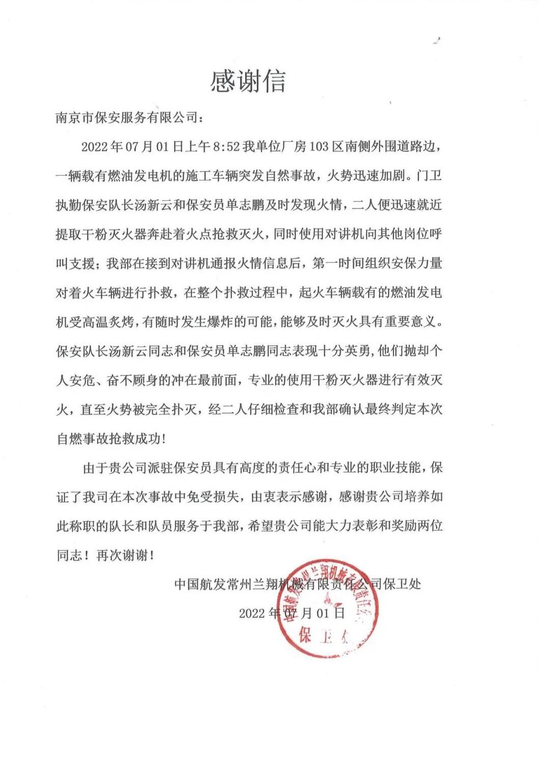 近期,南京市保安服務(wù)有限公司收到了一封來自中國航發(fā)常州蘭翔機械有限責(zé)任公司保衛(wèi)處的感謝信,信中對駐點保安員湯新云和單志鵬不顧自身安危、奮不顧身,及時處置火情保護駐點安全的行為表示衷心感謝。