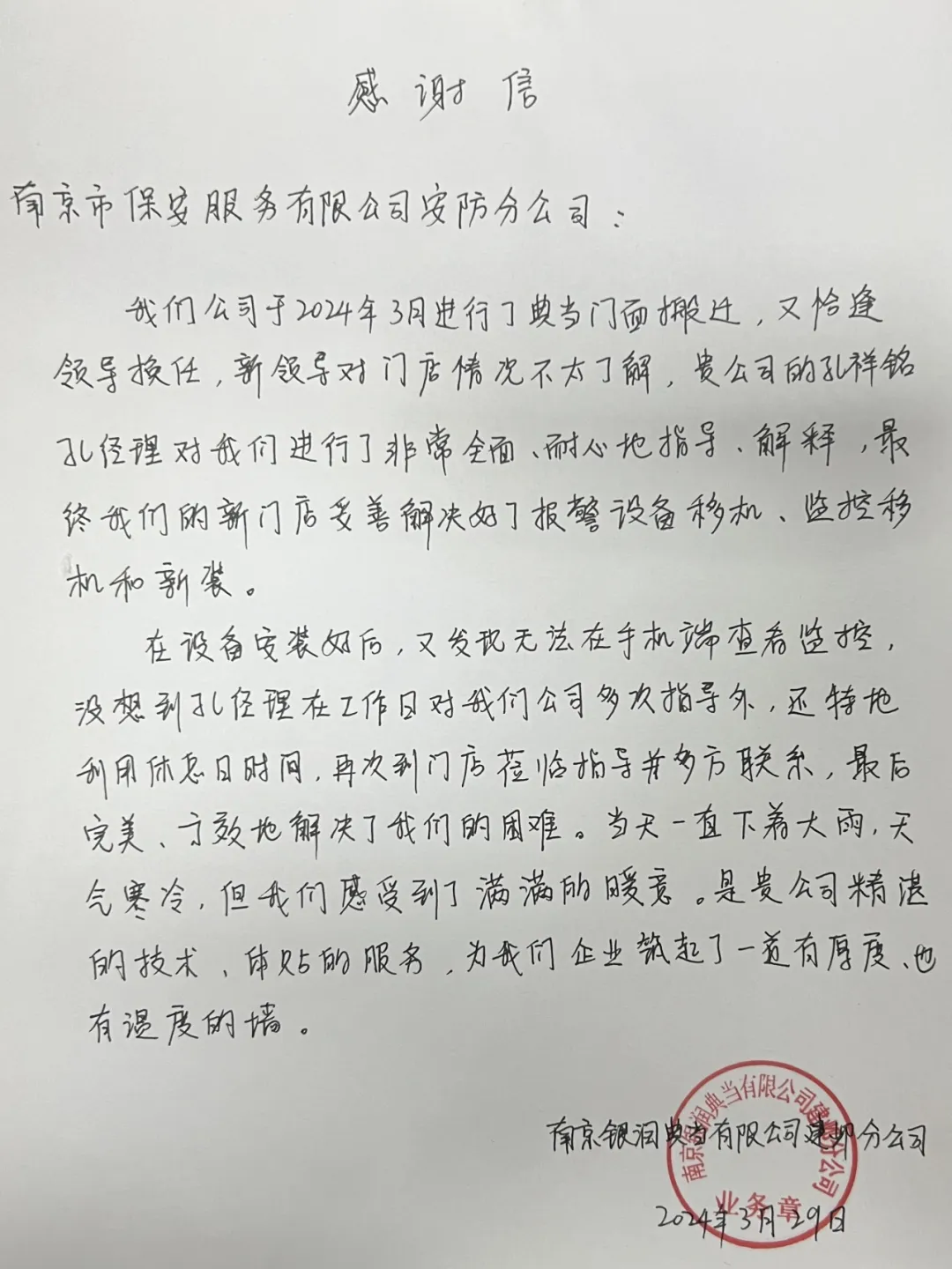 南京銀潤典當有限公司建鄴分公司在感謝信中提到,正是南京市保安服務有限公司精湛的技術和貼心的服務,為他們的企業(yè)構筑起了一道既有厚度、又有溫度的防護墻。這封感謝信不單是對孔祥銘經理的認可,更是對南京市保安服務有限公司安防團隊專業(yè)貼心服務的高度贊揚。公司安防團隊以專業(yè)的安防技術、高度敬業(yè)的精神和溫暖貼心的服務,切實地踐行了“用我,是您最佳選擇”的企業(yè)宗旨。
